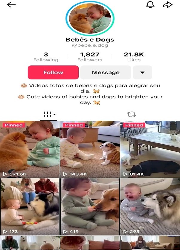 Ο λογαριασμός «Bebês e Dogs» εμφανίζεται να λειτουργεί ως σελίδα μαζικής παραγωγής συναισθηματικού περιεχομένου, χωρίς ενδείξεις ότι τα βίντεο αποτελούν πραγματικά, καταγεγραμμένα στιγμιότυπα από υπαρκτές οικογένειες. Η συστηματική χρήση του ίδιου αφηγηματικού μοτίβου, μωρό σε ουδέτερο εσωτερικό χώρο και σκύλος που επιδεικνύει συμπεριφορές που προσομοιάζουν ανθρώπινες αντιδράσεις, αποτελεί χαρακτηριστική πρακτική AI-generated περιεχομένου που στοχεύει στη μέγιστη συναισθηματική απήχηση και αλγοριθμική προώθηση.