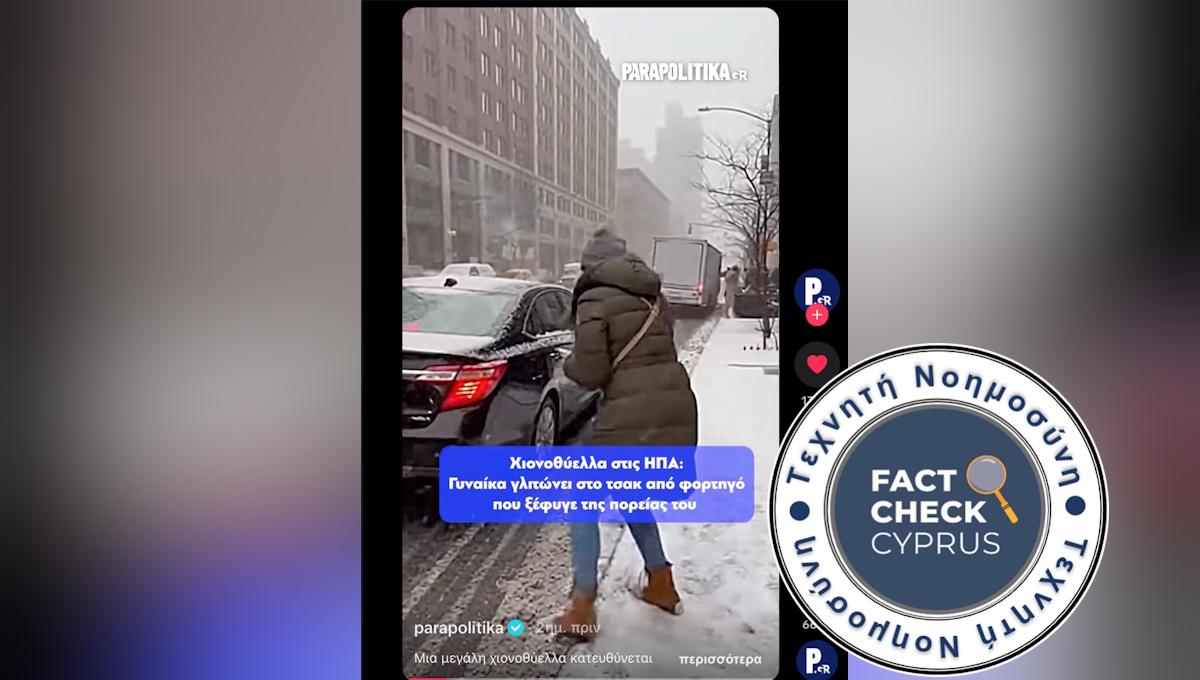 Τέλη Ιανουαρίου, βίντεο που αναρτήθηκε στη σελίδα TikTok της διαδικτυακής εφημερίδας Παραπολιτικά δείχνει μια γυναίκα να γλιτώνει την τελευταία στιγμή από φορτηγό που συγκρούεται με αυτοκίνητο μπροστά της, κατά τη διάρκεια της χειμερινής καταιγίδας που πλήττει τις Ηνωμένες Πολιτείες. Στο βίντεο εμφανίζεται λεζάντα που αναφέρει: «Χιονοθύελλα στις ΗΠΑ: Γυναίκα γλυτώνει στο τσακ από φορτηγό που ξέφυγε της πορείας του». Το συγκεκριμένο βίντεο συγκέντρωσε περισσότερες από 6.600 κοινοποιήσεις και πάνω από 810.000 προβολές στο TikTok.