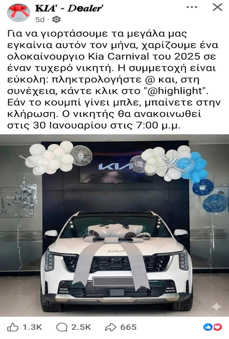 Μια δημοσίευση στο Facebook από τη σελίδα «KIA’ – Dealer’» υπόσχεται ένα δωρεάν Kia Carnival 2025. Η ανάρτηση αναφέρει: «Για να γιορτάσουμε τα μεγάλα μας εγκαίνια αυτόν τον μήνα, χαρίζουμε ένα ολοκαίνουργιο Kia Carnival του 2025 σε έναν τυχερό νικητή. Η συμμετοχή είναι εύκολη: πληκτρολογήστε @ και, στη συνέχεια, κάντε κλικ στο ‘@highlight’. Εάν το κουμπί γίνει μπλε, μπαίνετε στην κλήρωση. Ο νικητής θα ανακοινωθεί στις 30 Ιανουαρίου στις 7:00 μ.μ.».