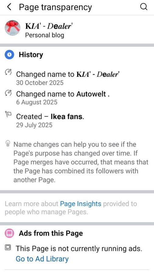 Σύμφωνα με τα στοιχεία της Meta, η σελίδα δημιουργήθηκε στις 29 Ιουλίου 2025 με το όνομα «Ikea fans». Στη συνέχεια, στις 6 Αυγούστου 2025, μετονομάστηκε σε «Autowelt.», και τελικά στις 30 Οκτωβρίου 2025 πήρε το τρέχον όνομα «KIA’ – Dealer’». Αυτή η πρακτική, χρησιμοποιείται συστηματικά από απατεώνες, οι οποίοι αποκτούν ή δημιουργούν σελίδες με ήδη υπάρχον κοινό και στη συνέχεια τις μετονομάζουν, προκειμένου να εμφανίζονται ως νόμιμες επιχειρήσεις.
