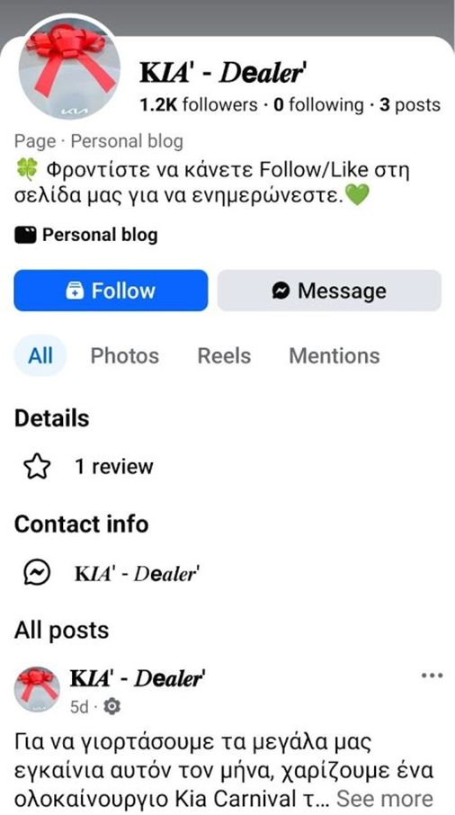 Πέραν του ιστορικού μετονομασιών, εντοπίστηκαν αρκετές επιπλέον κόκκινες σημαίες. Πρώτον, η σελίδα κατηγοριοποιείται ως «Personal blog» αντί για επίσημη αντιπροσωπεία αυτοκινήτων. Δεύτερο, το όνομα «KIA’ – Dealer’» περιέχει ασυνήθιστα σημεία στίξης (αποστρόφους) που αποτελούν προφανή προσπάθεια να αντιγραφεί το brand της Kia, ενώ παράλληλα αποφεύγει τα φίλτρα ανίχνευσης παραβίασης εμπορικών σημάτων. Τρίτο, ο μηχανισμός συμμετοχής που ζητά από τους χρήστες να πληκτρολογήσουν «@» και να κάνουν κλικ στο «@highlight» είναι μια κλασική τεχνική «engagement farming» που στοχεύει στην ενίσχυση της αλγοριθμικής εμβέλειας της ανάρτησης. Τέταρτο, η σελίδα έχει μόλις 3 αναρτήσεις και 0 λογαριασμούς που ακολουθεί (0 following), ενώ διαθέτει 1.200 followers, προφίλ που δεν ταιριάζει με νόμιμη επιχείρηση.