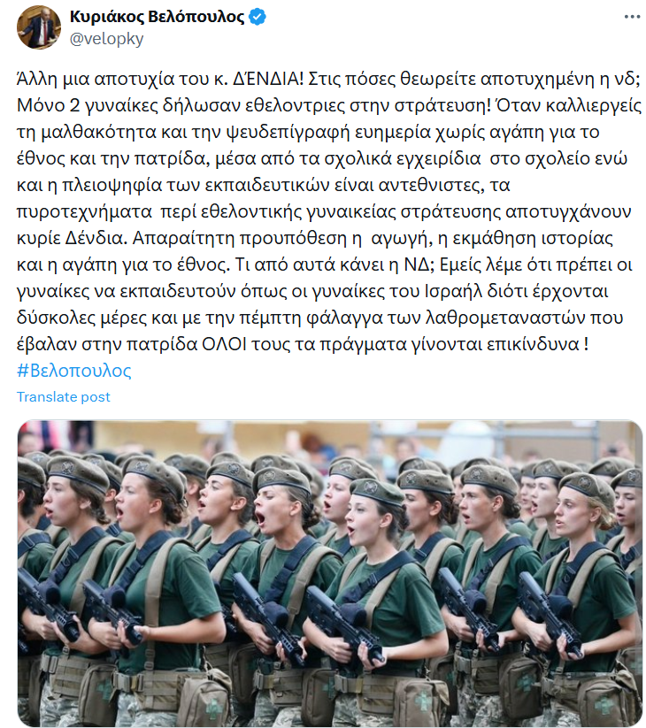 Στις 8 Νοεμβρίου 2025, ο πρόεδρος της Ελληνικής Λύσης Κυριάκος Βελόπουλος δημοσίευσε ανάρτηση στο X ισχυριζόμενος ότι στην Ελλάδα “μόνο 2 γυναίκες δήλωσαν εθελόντριες στην στράτευση” και χαρακτηρίζοντας αυτό αποτυχία του Υπουργού Εθνικής Άμυνας Νίκου Δένδια. Στην ανάρτησή του, ο Βελόπουλος κάνει αιχμηρή κριτική για την κατάσταση της εκπαίδευσης και την πολιτική του Υπουργείου, χρησιμοποιώντας τον συγκεκριμένο αριθμό ως απόδειξη αποτυχίας.