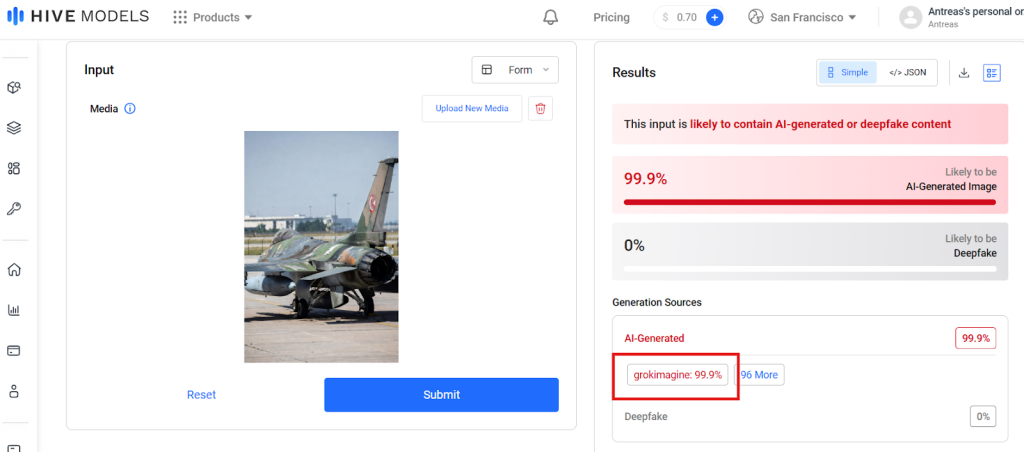 Συγκεκριμένα, το Hive ανέφερε ως πηγή δημιουργίας το GrokImagine (99.9% και 98.9% αντίστοιχα),