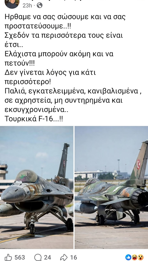 Η πραγματικότητα για τον στόλο F-16 της Τουρκίας είναι διαμετρικά αντίθετη από αυτή που παρουσιάζει η ανάρτηση. Η Τουρκική Αεροπορία διαθέτει πάνω από 230 F-16C/D, τη δεύτερη μεγαλύτερη συλλογή παγκοσμίως μετά τις ΗΠΑ  και βρίσκεται σε εξέλιξη πολυεπίπεδου εκσυγχρονισμού: 40 νέα F-16 Block 70 εγκρίθηκαν από τις ΗΠΑ τον Ιανουάριο του 2024, ενώ η Τουρκική Αεροδιαστημική Βιομηχανία (TAI) υλοποιεί παράλληλα το εγχώριο πρόγραμμα ÖZGÜR για αναβάθμιση 35 F-16 Block 30 με εθνικά συστήματα (πηγή: Lockheed Martin Turkey· πηγή: The Guardian). Επιπλέον, τον Οκτώβριο του 2025 η Τουρκία υπέγραψε συμφωνία £8 δισ. με το Ηνωμένο Βασίλειο για 20 Eurofighter Typhoon Tranche 4, ενώ το εγχώριο μαχητικό 5ης γενιάς TAI TF KAAN, αναμένεται να αντικαταστήσει σταδιακά τα F-16 από τις αρχές της δεκαετίας του 2030 (πηγή: BBC News· πηγή: UK Government· πηγή: Wikipedia).