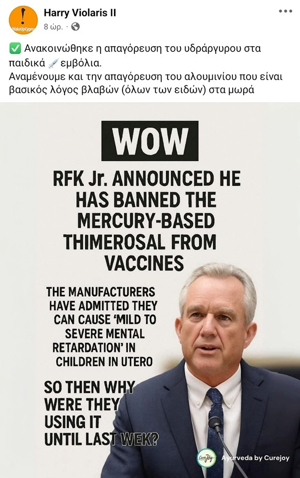 Μια ανάρτηση στο Facebook αναφέρει ότι ανακοινώθηκε η απαγόρευση του υδραργύρου στα παιδικά εμβόλια και ότι αναμένεται η απαγόρευση του αλουμινίου, το οποίο χαρακτηρίζεται ως βασική αιτία βλαβών στα μωρά. Η ανάρτηση αυτή δημοσιεύτηκε έπειτα από πρόσφατη ανακοίνωση στις ΗΠΑ για την αφαίρεση της θειομερσάλης από όλα τα εμβόλια γρίπης.