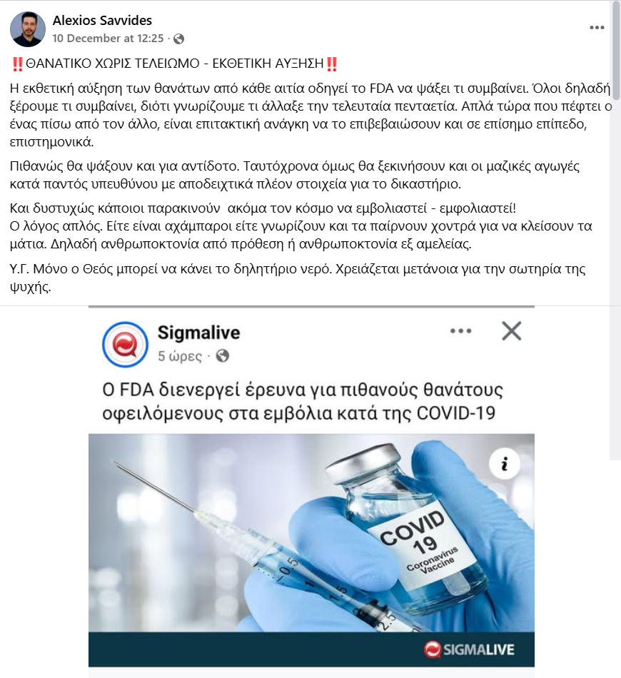 Στα social media κυκλοφορεί ισχυρισμός ότι ο αμερικανικός οργανισμός φαρμάκων (FDA) διενεργεί έρευνα για “εκθετική αύξηση” θανάτων που οφείλονται στα εμβόλια κατά της COVID-19. Ο ισχυρισμός προβλέπει “μαζικές αγωγές” με “πλέον στοιχεία για το δικαστήριο” και κατηγορεί όσους ενθάρρυναν τον εμβολιασμό για “ανθρωποκτονία από πρόθεση ή ανθρωποκτονία εξ αμελείας”. Ο ισχυρισμός επικαλείται, αρθρο του Sigmalive, που δημοσίευσε άρθρο με τίτλο “ΗΠΑ: Έρευνα για πιθανούς θανάτους από τα εμβόλια κατά της covid-19” .