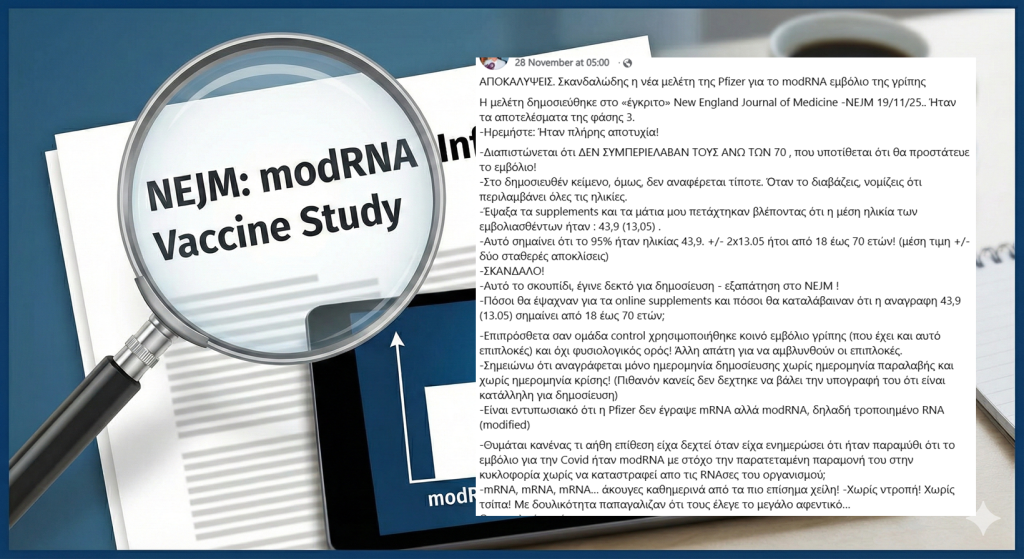 Δημοσιεύσεις στα μέσα κοινωνικής δικτύωσης (εδώ και εδώ), βασισμένες σε άρθρα του Children’s Health Defense και του Alex Berenson, υποστηρίζουν ότι η Pfizer και το ιατρικό περιοδικό New England Journal of Medicine (NEJM) συνεργάστηκαν για να καλύψουν την αποτυχία και την επικινδυνότητα του νέου modRNA εμβολίου γρίπης. Οι αναρτήσεις επικαλούνται τα αποτελέσματα της Φάσης 3 (μελέτη C4781004 / NCT05540522) που δημοσιεύθηκαν τον Νοέμβριο του 2025, κάνοντας λόγο για “εγκληματική χειραγώγηση”.