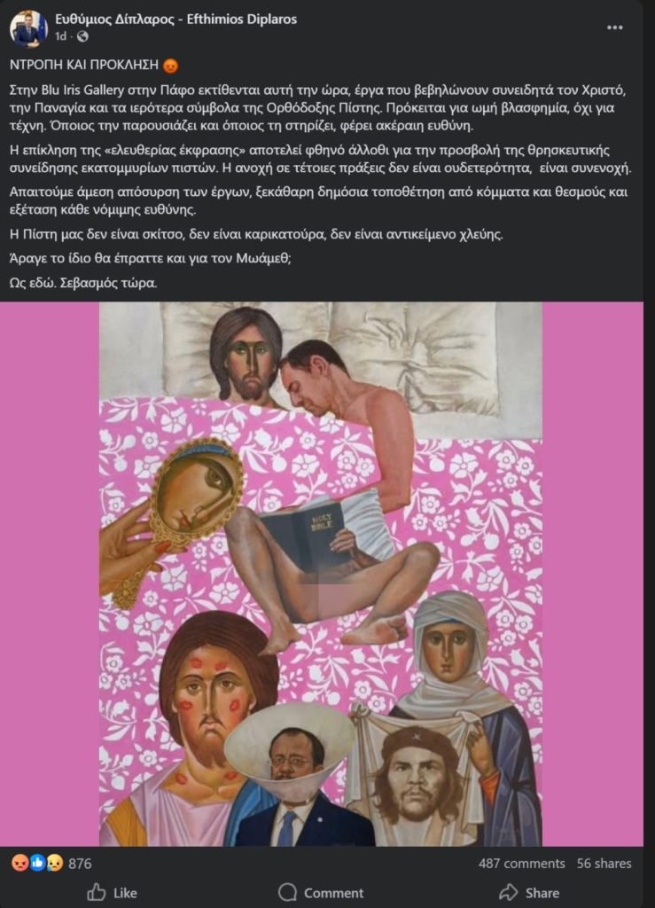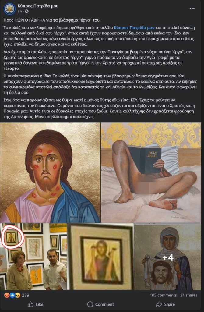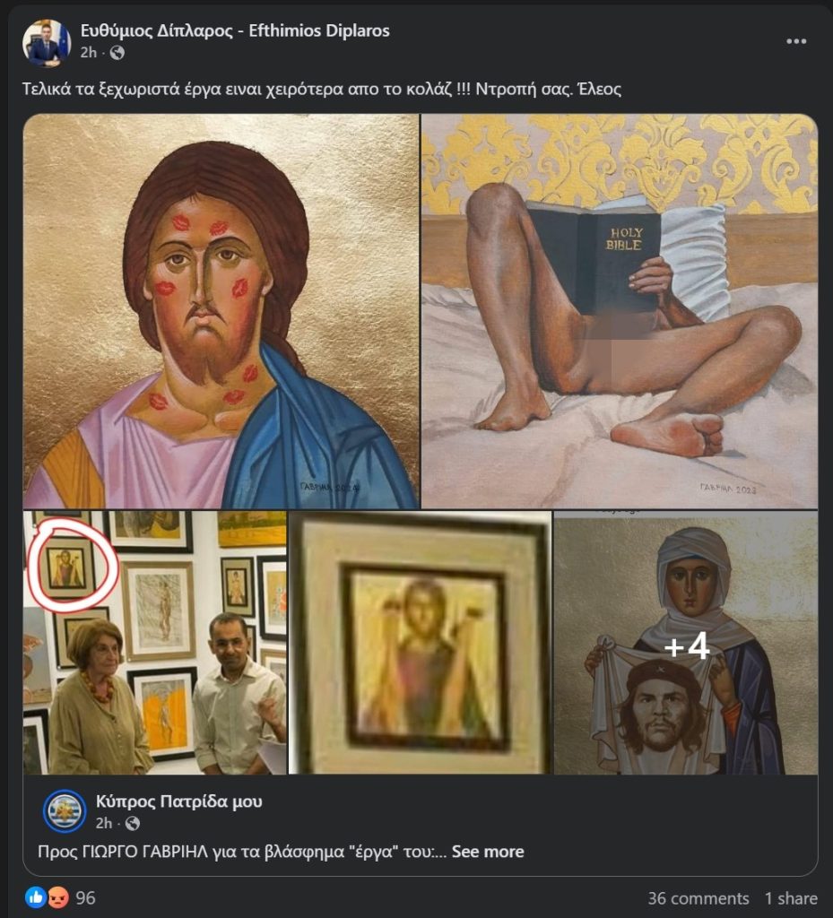 Ισχυρισμός: Εικόνα του Γιώργου Γαβριήλ συνοδεύεται από την παρατήρηση: “ΝΤΡΟΠΗ ΚΑΙ ΠΡΟΚΛΗΣΗ. Στην Blu Iris Gallery στην Πάφο εκτίθενται αυτή την ώρα, έργα που βεβηλώνουν συνειδητά τον Χριστό, την Παναγία και τα ιερότερα σύμβολα της Ορθόδοξης Πίστης. Πρόκειται για ωμή βλασφημία, όχι για τέχνη. Όποιος την παρουσιάζει και όποιος τη στηρίζει, φέρει ακέραιη ευθύνη.”