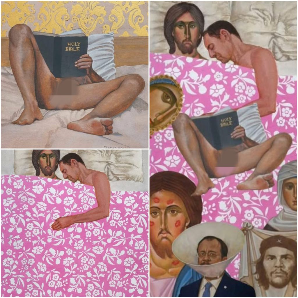 Αναζητώντας τα έργα του Γιώργου Γαβριήλ, διαπιστώσαμε και εμείς πως όντως η αρχική εικόνα αποτελεί προϊόν συρραφής διάφορων έργων του. Μάλιστα, έχουν τοποθετηθεί με τέτοιο τρόπο ούτως ώστε να φαίνονται ανδρικά γεννητικά όργανα που μπορεί να ερμηνευτεί πως ανήκουν στο σώμα του Χριστού. Στην πραγματικότητα, είναι δυο εντελώς ξεχωριστά έργα όπως μπορείτε να δείτε στο παρακάτω κολάζ που δημιουργήσαμε εμείς: