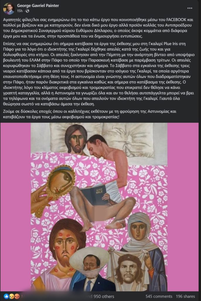 Στις 13 Δεκεμβρίου 2025, ο βουλευτής και αναπληρωτής πρόεδρος του Δημοκρατικού Συναγερμού, Ευθύμιος Δίπλαρος, έκανε ανάρτηση στο Facebook στην οποία αναφέρθηκε σε έργα του ζωγράφου Γιώργου Γαβριήλ τα οποία εκτίθενται στην Γκαλερί Τέχνης Blu Iris στην Πάφο και τα οποία θεωρεί ότι “βεβηλώνουν συνειδητά τον Χριστό, την Παναγία και τα ιερότερα σύμβολα της Ορθόδοξης Πίστης“. Προσθέτει ότι “πρόκειται για ωμή βλασφημία, όχι για τέχνη” και ότι “Η ανοχή σε τέτοιες πράξεις δεν είναι ουδετερότητα, είναι συνενοχή.”. Ταυτόχρονα απαιτεί σε “άμεση απόσυρση των έργων, ξεκάθαρη δημόσια τοποθέτηση από κόμματα και θεσμούς και εξέταση κάθε νόμιμης ευθύνης“. Η ανάρτηση αυτή συνοδευόταν από μία εικόνα με δημιουργίες του Γιώργου Γαβριήλ που περιέχουν θρησκευτικά και πολιτικά πρόσωπα και συμβολισμούς.