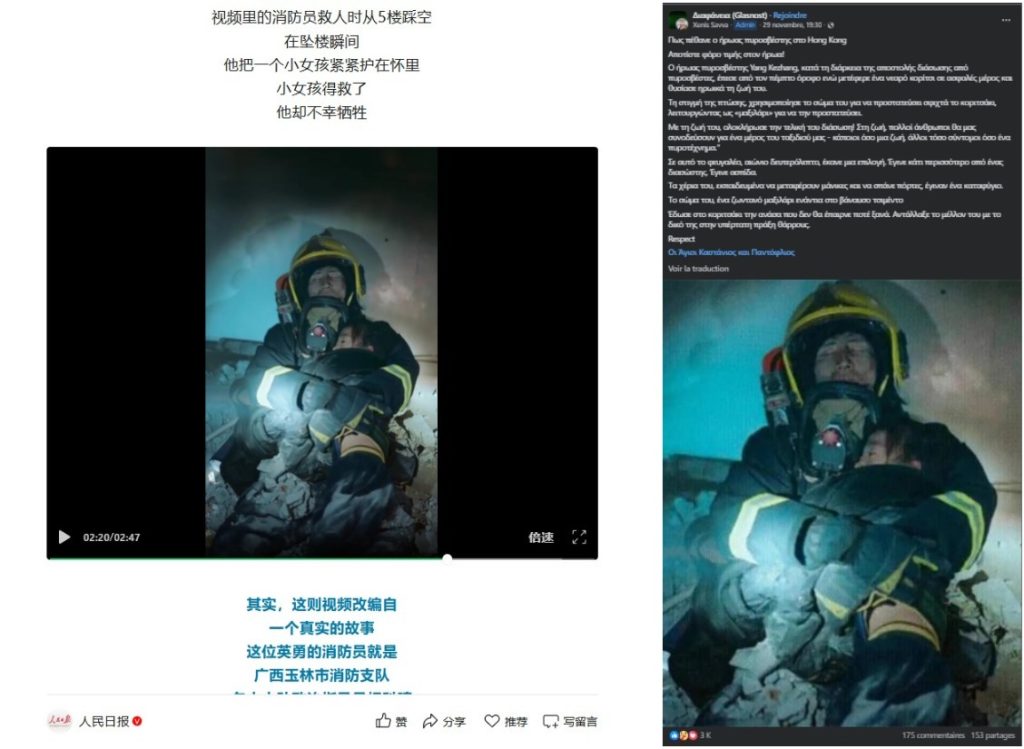 Η ίδια φωτογραφία και ο ίδιος ισχυρισμός δημοσιεύτηκαν και αλλού στο Facebook στα ελληνικά, εδώ και εδώ. Μια ανάρτηση στο X δεν αναφέρει το Hong Kong ως τόπο του συμβάντος, αλλά υποστηρίζει ότι η φωτογραφία δείχνει τον πυροσβέστη Yang Kezhang.