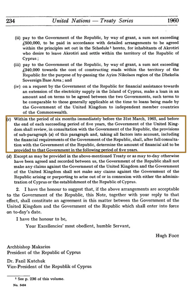 Στη συμφωνία ανεξαρτησίας προβλεπόταν ότι η Βρετανία θα έδινε οικονομική βοήθεια στην Κυπριακή Δημοκρατία τα πρώτα χρόνια μετά την ανεξαρτησία. Πράγματι, μεταξύ 1961 και 1965 καταβλήθηκαν περίπου 12 εκατομμύρια στερλίνες σε δόσεις, όπως προέβλεπε η αρχική συμφωνία. Επρόκειτο για μεταβατική οικονομική βοήθεια (“by way of grant”) που θα επανεξεταζόταν έξι μήνες πριν το πέρας της πρώτης πενταετίας, σε διαβούλευση με την Κυπριακή Δημοκρατία.
