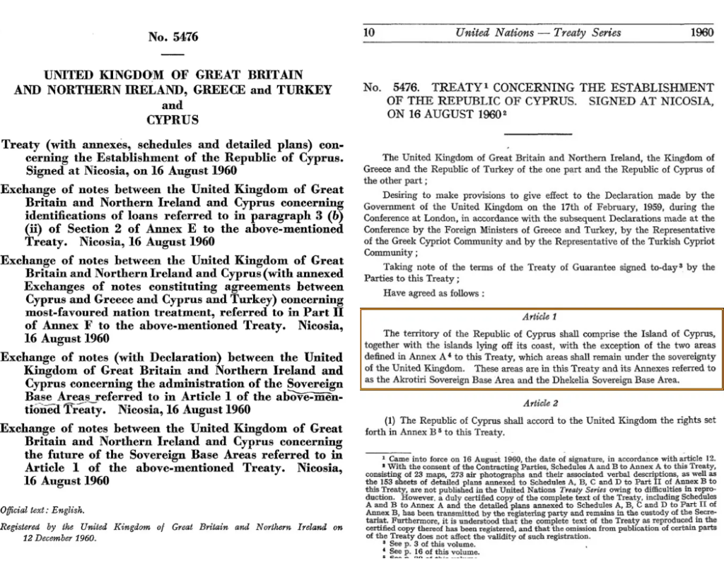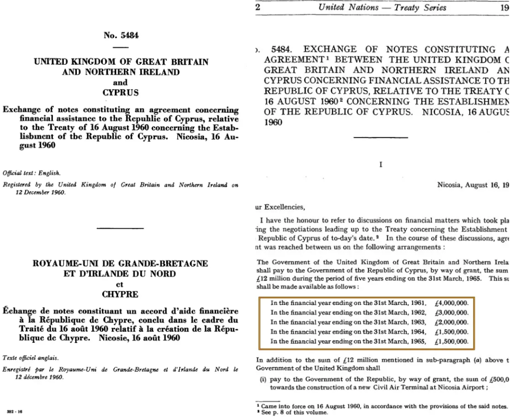 Συμπέρασμα: Η συμφωνία του 1960 προέβλεπε οικονομική βοήθεια 12 εκατομμυρίων στερλινών προς την Κυπριακή Δημοκρατία για την περίοδο 1960 –1965 και δυνατότητα επανεξέτασης της βοήθειας κάθε πέντε χρόνια σε διαβούλευση μεταξύ των δύο κυβερνήσεων. Παράλληλα, οι βρετανικές βάσεις ορίστηκαν ως κυρίαρχο βρετανικό έδαφος και δεν υπάρχει στη συμφωνία πρόβλεψη για ενοίκιο ή μίσθωση των βάσεων από την Κυπριακή Δημοκρατία.