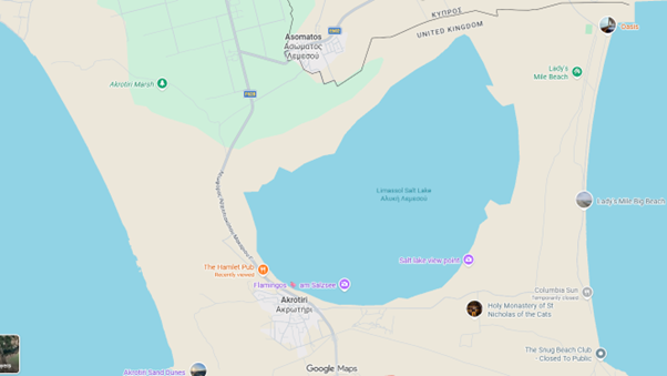 Η χαρακτηριστική κόκκινη πινακίδα των Βρετανικών Βάσεων (SBA) με το λευκό στέμμα και την ένδειξη “No Photography” ταυτοποιεί το σημείο ως το βόρειο όριο της βάσης Ακρωτηρίου στον δρόμο F628. Αν και οι δορυφορικές λήψεις δείχνουν όλη την περιοχή, η ψηφιακή περιήγηση (Street View) διακόπτεται στο σημείο της κόκκινης πινακίδας, καθώς εκεί ξεκινά η ελεγχόμενη στρατιωτική ζώνη των Βάσεων.