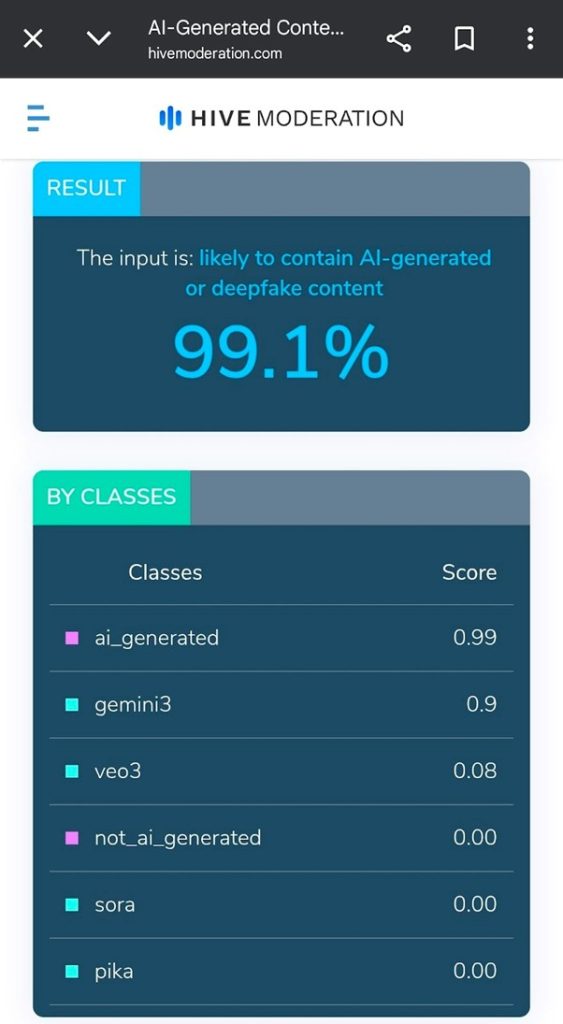 Η ανάλυση μέσω του Hive Moderation έδειξε σημαντικές ενδείξεις ότι η εικόνα δεν είναι φυσική φωτογραφία, με καταγραφές που παραπέμπουν σε μοντέλα παραγωγής εικόνων όπως το Gemini.
