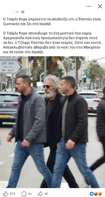 Αρχές Φεβρουαρίου, μία φωτογραφία με τον ισχυρισμό ότι δείχνει τον Τζέφρι Επστάιν ζωντανό στο Τελ Αβίβ κοινοποιήθηκε στο Facebook και σε άλλα μέσα κοινωνικής δικτύωσης στα ελληνικά. Η χρονική στιγμή της εμφάνισης αυτής της εικόνας δεν είναι τυχαία, καθώς συμπίπτει με τη μεγαλύτερη αποκάλυψη αρχείων στην ιστορία της υπόθεσης του αμερικανού δισεκατομυριούχου.