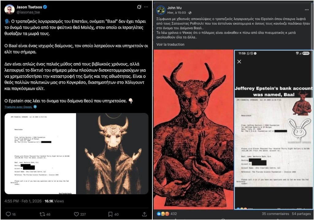 Αρχές Φεβρουαρίου, ανάρτηση στο X κοινοποίησε εικόνα εγγράφου που φαίνεται να προέρχεται από την πιο πρόσφατη δημοσιοποίηση στις Ηνωμένες Πολιτείες εγγράφων που σχετίζονται με την υπόθεση του δισεκατομμυριούχου Τζέφρι Έπσταϊν. Ο συντάκτης της ανάρτησης γράφει: «Ο τραπεζικός λογαριασμός του Επστάιν, ονόματι “Baal”, δεν έχει πάρει το όνομά του μόνο από τον ψεύτικο θεό Μολόχ, στον οποίο οι Ισραηλίτες θυσίαζαν τα μωρά τους». Συνεχίζει περιγράφοντας τον θεό Βάαλ ως έναν «ισχυρό δαίμονα», τον οποίο «υπηρετούν οι σημερινές ελίτ».