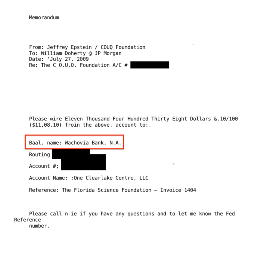 Εξετάζοντας άλλα έγγραφα στον ιστότοπο του DOJ, εντοπίσαμε παρόμοια τραπεζική μεταφορά με αναγνωριστικό EFTA01579975 (αρχειοθετημένο εδώ), προς την ίδια τράπεζα, τη Wachovia Bank, λίγες ημέρες νωρίτερα, στις 27 Ιουλίου 2009. Εκεί αναγράφεται ξεκάθαρα στα αγγλικά: «Bank name: Wachovia Bank, N.A.».