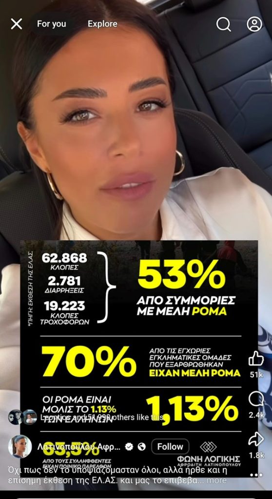 Ο ισχυρισμός ότι το 53% των κλοπών και διαρρήξεων διαπράττονται από Ρομά δεν βασίζεται σε επίσημα στατιστικά στοιχεία και παραποιεί τα δεδομένα της έκθεσης της ΕΛ.ΑΣ. για το οργανωμένο έγκλημα του 2023. Η έκθεση αφορά αποκλειστικά τα μέλη των εξαρθρωμένων εγχώριων εγκληματικών ομάδων, και όχι το σύνολο των κλοπών ή διαρρήξεων στη χώρα.