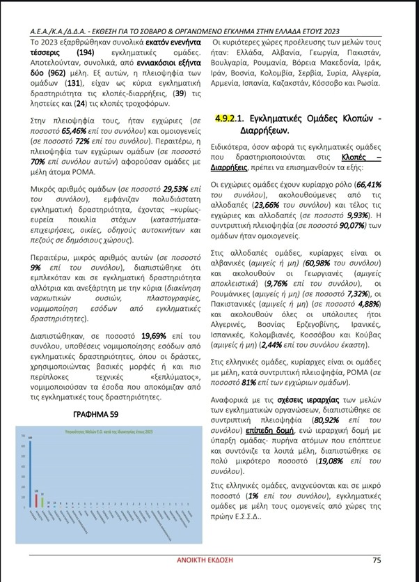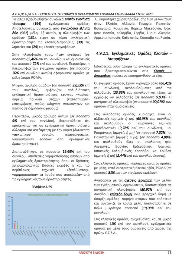 Σύμφωνα με τα στοιχεία της ΕΛ.ΑΣ. (στον ετήσιο απολογισμό εγκληματικότητας), οι δήλωμένες κλοπές και διαρρήξεις στη χώρα υπερβαίνουν τις 400.000 υποθέσεις ετησίως, ενώ η Έκθεση Οργανωμένου Εγκλήματος 2023 αναφέρει ότι εξαρθρώθηκαν 194 εγκληματικές ομάδες με 962 μέλη. Δεν γνωρίζουμε όμως για τι ποσοστό των ληστειών ευθύνονται αυτές οι οργανωμένες ομάδες. Τα δεδομένα της έκθεσης αφορούν μόνο το υποσύνολο των εξαρθρωμένων ομάδων οργανωμένου εγκλήματος και δεν μπορούν να χρησιμοποιηθούν για να εξαχθεί συνολικό ποσοστό εγκληματικότητας για καμία κοινωνική ομάδα.