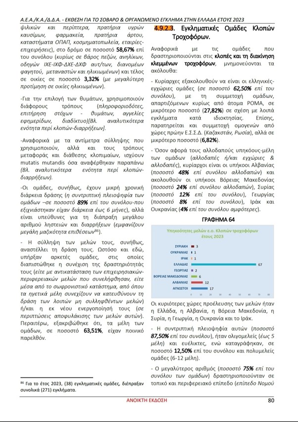 Στη συνέχεια στην ενότητα 4.9.2.3 Εγκληματικές Ομάδες Κλοπών Τροχοφόρων στη σελίδα 87 σημειώνεται ότι οι ελληνικές εγχώριες ομάδες ανέρχονται σε 62,50% επί του συνόλου, με τη συμμετοχή ομάδων απαρτιζόμενων κυρίως από άτομα Ρομά σε ποσοστό 27,82%.