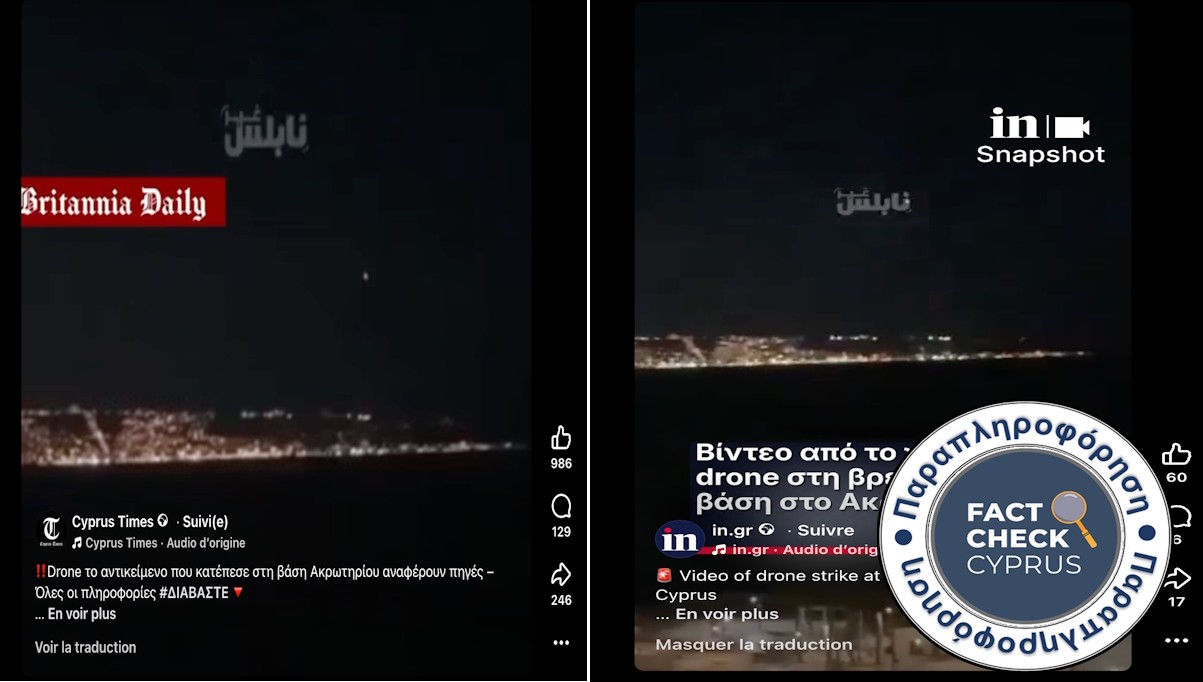 Ωστόσο, αυτοί οι ισχυρισμοί είναι ψευδείς και παραπλανητικοί. Αν και ένα drone έπληξε πράγματι τη βάση στο Ακρωτήρι, το συγκεκριμένο βίντεο δεν δείχνει αυτό το περιστατικό, αλλά ένα ιρανικό πλήγμα στη Χάιφα του Ισραήλ, λίγες ώρες νωρίτερα.