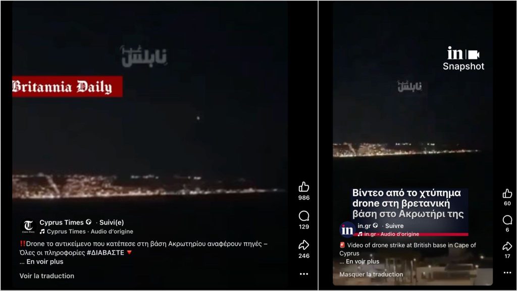 Στις 2 Μαρτίου 2026, ένα drone έπληξε επίσης τη βρετανική αεροπορική βάση στο Ακρωτήρι της Κύπρου. Στο πλαίσιο αυτό, ένα βίντεο άρχισε να κυκλοφορεί λίγες ώρες μετά το πλήγμα, με τον ισχυρισμό ότι έδειχνε το drone να πέφτει στη βρετανική βάση στο Ακρωτήρι. Το βίντεο κοινοποιήθηκε στο Facebook και στο X στα ελληνικά, καθώς και από μέσα ενημέρωσης, μεταξύ των οποίων το Cyprus Times στο Facebook (504 χιλ. προβολές), καθώς και το In.gr στις σελίδες του στο Facebook (25 χιλ. προβολές), στο Instagram (315 χιλ. προβολές) και στο TikTok (5.600 προβολές).