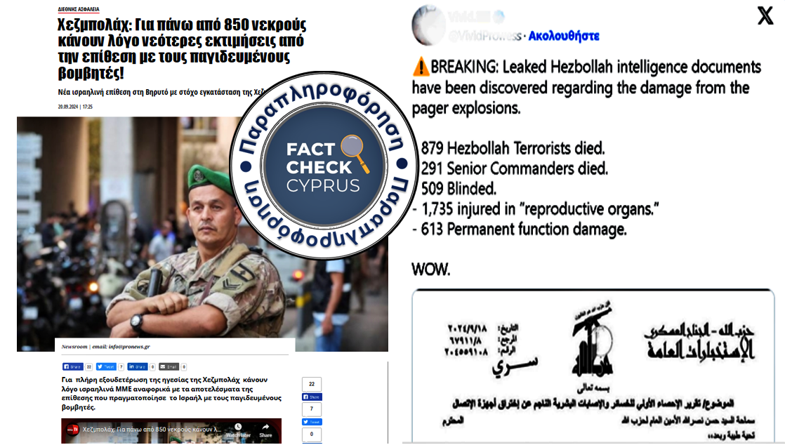Οι ισχυρισμοί για μεγαλύτερο εύρος απωλειών και τραυματισμών προέρχεται από δημοσίευση του Δρ Eli David στην πλατφόρμα “X” σχετικά με ένα έγγραφο πληροφοριών της Χεζμπολάχ που διέρρευσε, αναφέροντας ότι 879 άτομα που προσδιορίστηκαν ως τρομοκράτες πέθαναν στον Λίβανο λόγω εκρήξεων, συμπεριλαμβανομένων 291 ανώτερων διοικητών της Χεζμπολάχ. Αυτός ο ισχυρισμός έχει κερδίσει την προσοχή στα μέσα κοινωνικής δικτύωσης, αλλά δεν υπάρχουν επίσημες επαληθεύσεις που να τον υποστηρίζουν. Η είδηση μεταδόθηκε από σελίδες παραπληροφόρησης σε διάφορες χώρες και στην Ελλάδα μεταξύ άλλων από το pronews.gr, triklopodia.gr, makeleio.gr και www.e-synews.gr