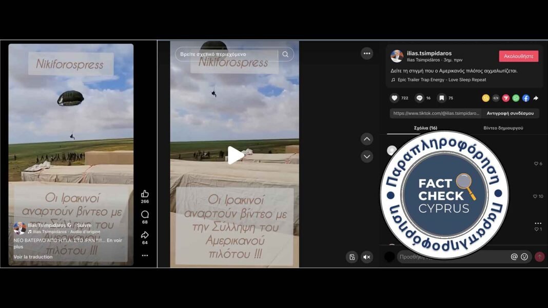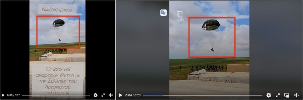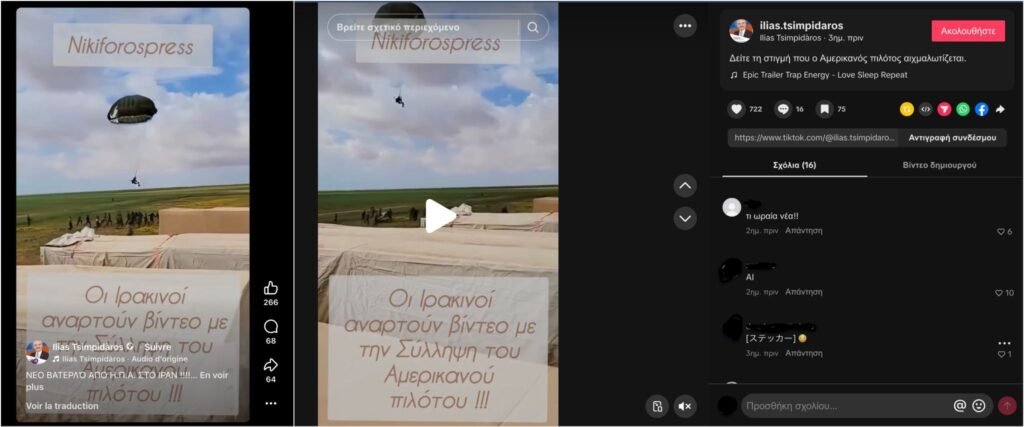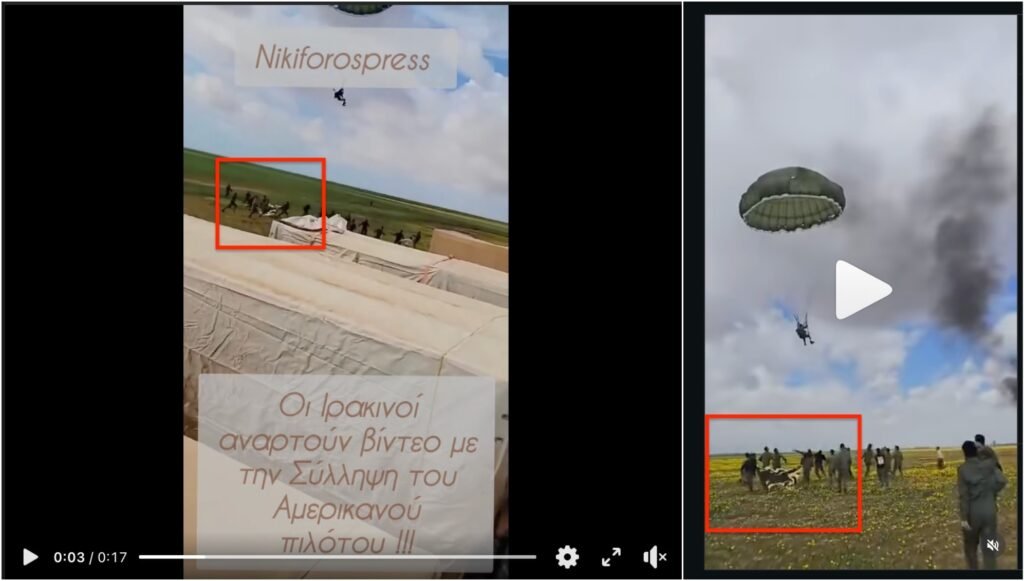 Στο πλαίσιο αυτό, ένα βίντεο άρχισε να κυκλοφορεί στις 5 Απριλίου 2026, στα ελληνικά στο Facebook και στο TikTok, το οποίο δείχνει έναν άνδρα με αλεξίπτωτο να προσγειώνεται μέσα σε πλήθος ανδρών, με τον ισχυρισμό ότι πρόκειται για τον Αμερικανό πιλότο τη στιγμή της σύλληψής του από Ιρανούς. Στο TikTok, το βίντεο συγκέντρωσε περισσότερες από 78.000 προβολές και στο Facebook 38.000 προβολές.